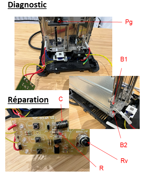 Après démontage, hors tension, on remplace le condensateur C et la résistance R à l’identique et le condensateur C explose à nouveau. On réalise un test de résistance entre les bornes B1 et B2 d’extrémité de la résistance chauffante du grille pain (qui s’étend le long des parois du grille pain sous la forme d’une bande résistive continue agencée en serpentin) et on remarque avoir une valeur de résistance infinie entre ces bornes.
